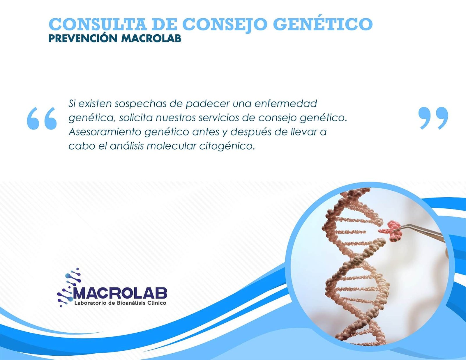 MACROLAB dispone de un servicio de consejo genético para el asesoramiento médico de pacientes y personas con riesgo de padecer trastornos genéticos, generalmente mendelianos (asociados a un solo gen) y que son motivos de diversos estudios, de tipo diagnóstico (confirmación de la enfermedad), presintomático, pronóstico y especialmente terapéutico: para facilitar el tratamiento más adecuado y medidas preventivas, incluidas la vigilancia médica.