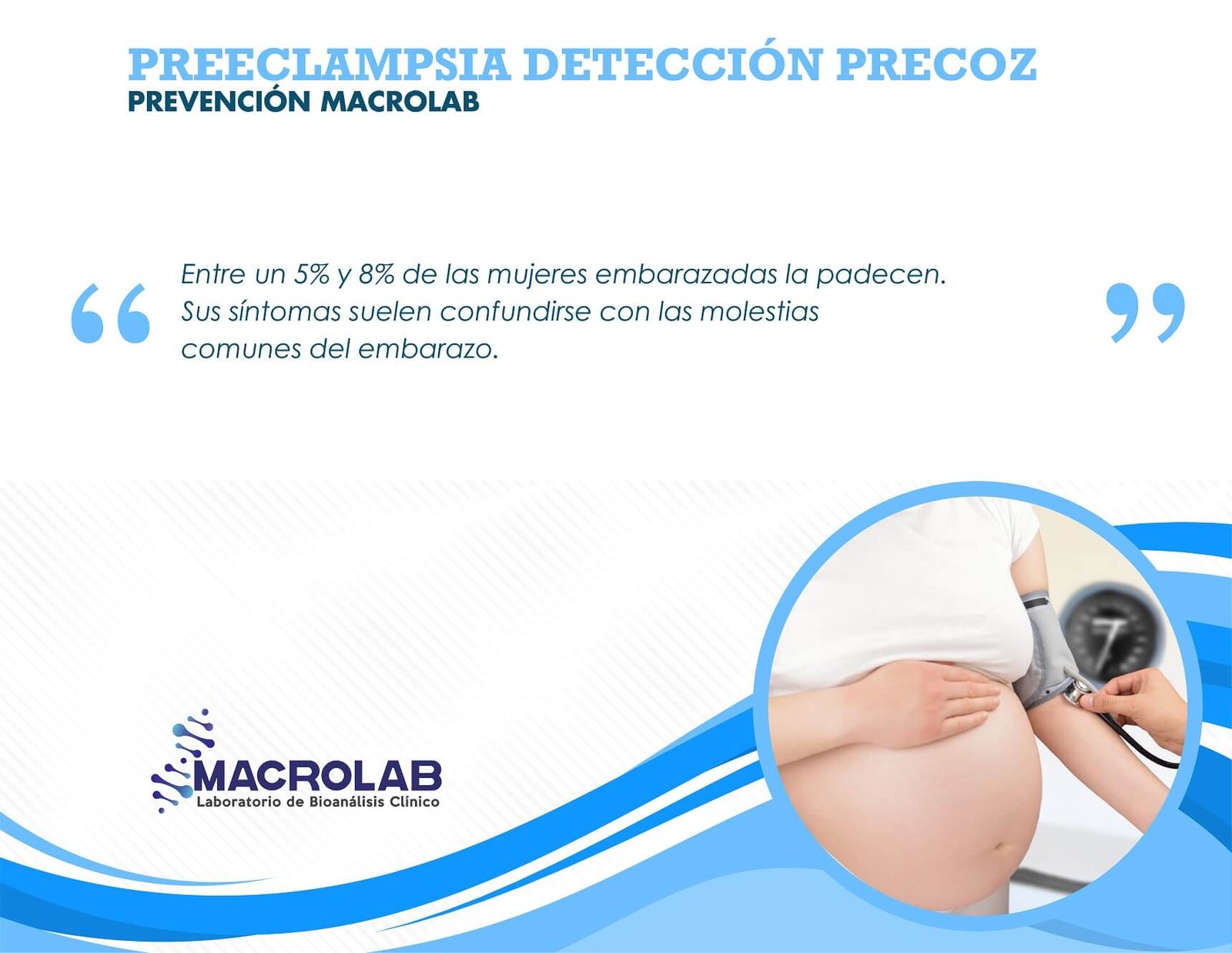La preeclampsia es una condición que combina presión arterial elevada (más de 140/90) y cantidades excesivas de proteínas en la orina de la madre. Se produce cuando la placenta no llega a desarrollarse por completo y crea hipertensión arterial en los vasos sanguíneos maternos. La enfermedad puede presentarse después de la semana 20 de embarazo, aunque la mayoría de los casos son a partir de la semana 37. El problema más grave de la preeclampsia es que puede aparecer de repente y progresar con velocidad ya que sus síntomas suelen confundirse con molestias comunes del embarazo. Al afectar el riego sanguíneo, pone en riesgo tanto la salud de la madre como la del bebé. Puede causar desprendimiento de la placenta, bajo peso al nacer, ocasionar nacimientos prematuros, e incluso muerte de la madre o el bebé.